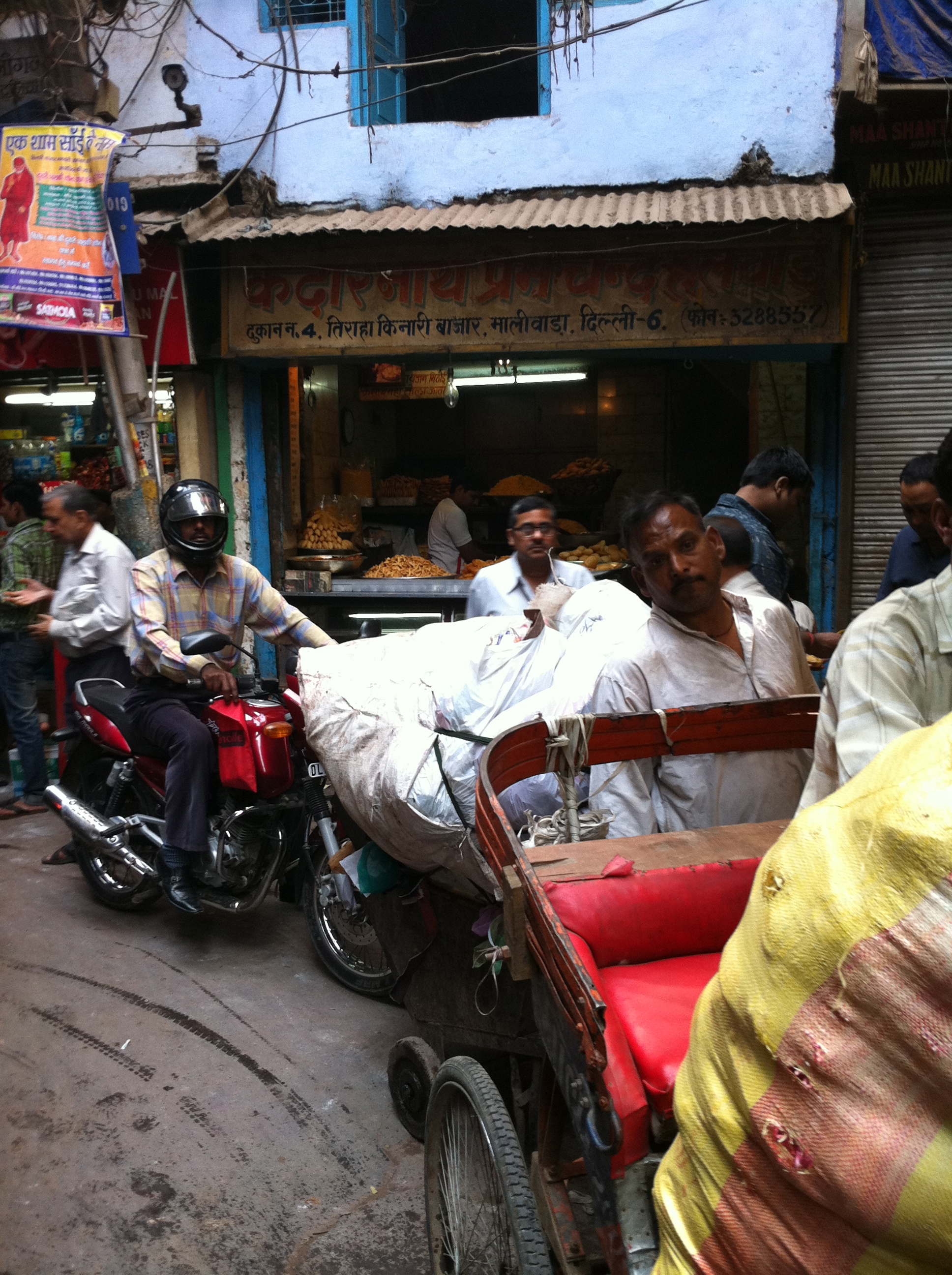 The bicycle rickshaw man has a difficult job (left), starting the ride through Chandni Chowk in Old Delhi (right)