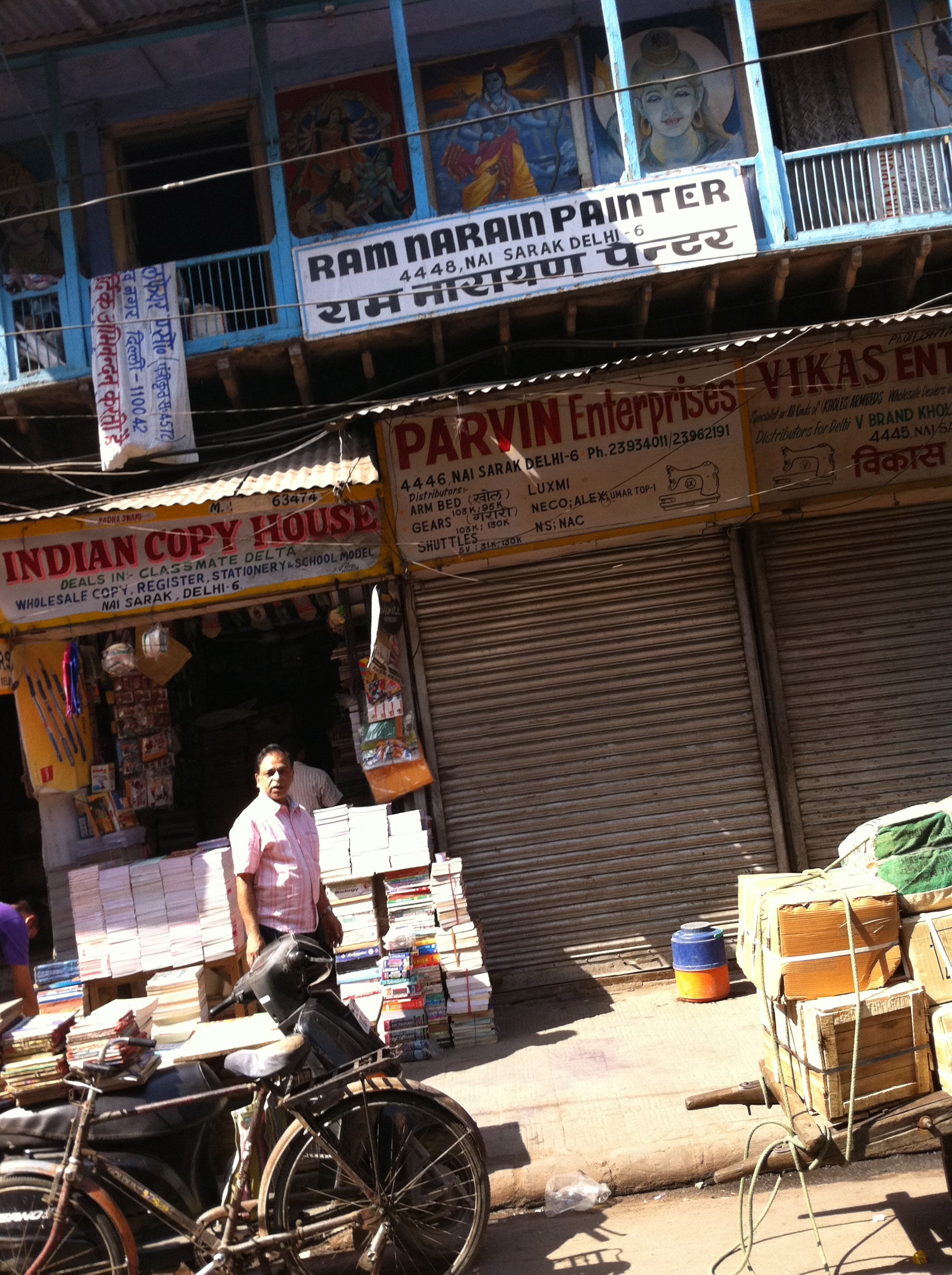 The guide rightfully called this “an electrician’s nightmare” (left), we went several blocks through an area that supplied books, stationery, paper, etc. for all of India (right)