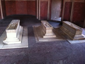 I’ll quote again from Wikipedia about the building itself. “As a contrast to the pure white exterior dome, the rest of the building is made up of red sandstone, with white and black marble and yellow sandstone detailing, to relieve the monotony. The symmetrical and simple design on the exterior is in sharp contrast with the complex interior floor plan, of inner chambers, which is a square ‘ninefold plan’, where eight two-storyed vaulted chambers radiate from the central, double-height domed chamber.”