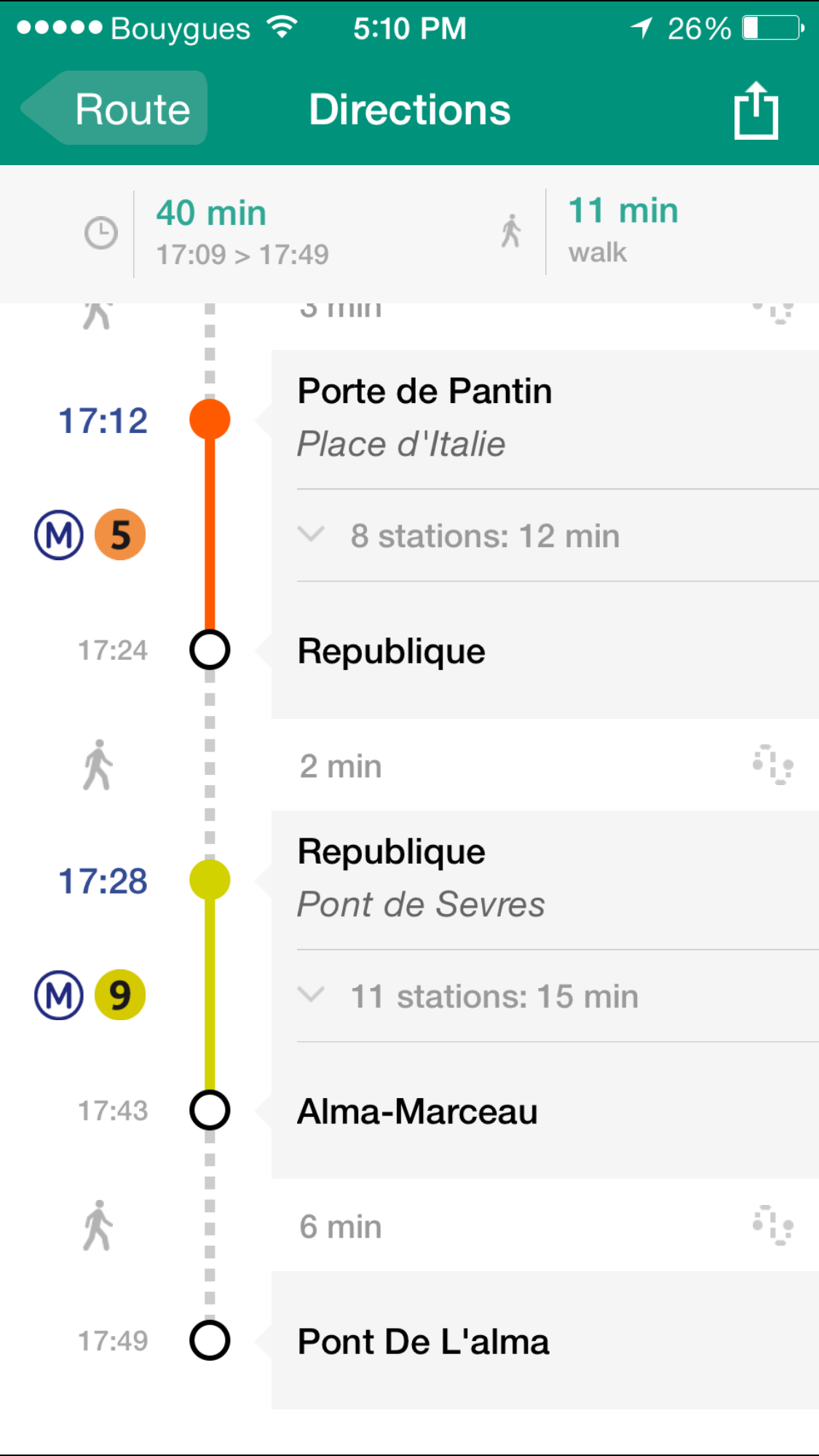 I highly recommend the app “Moves”. I kept it running on my iPhone at all times and it shows on a map exactly where I went and how long each segment took. It also shows how many steps, distance travelled, and how many calories were consumed.