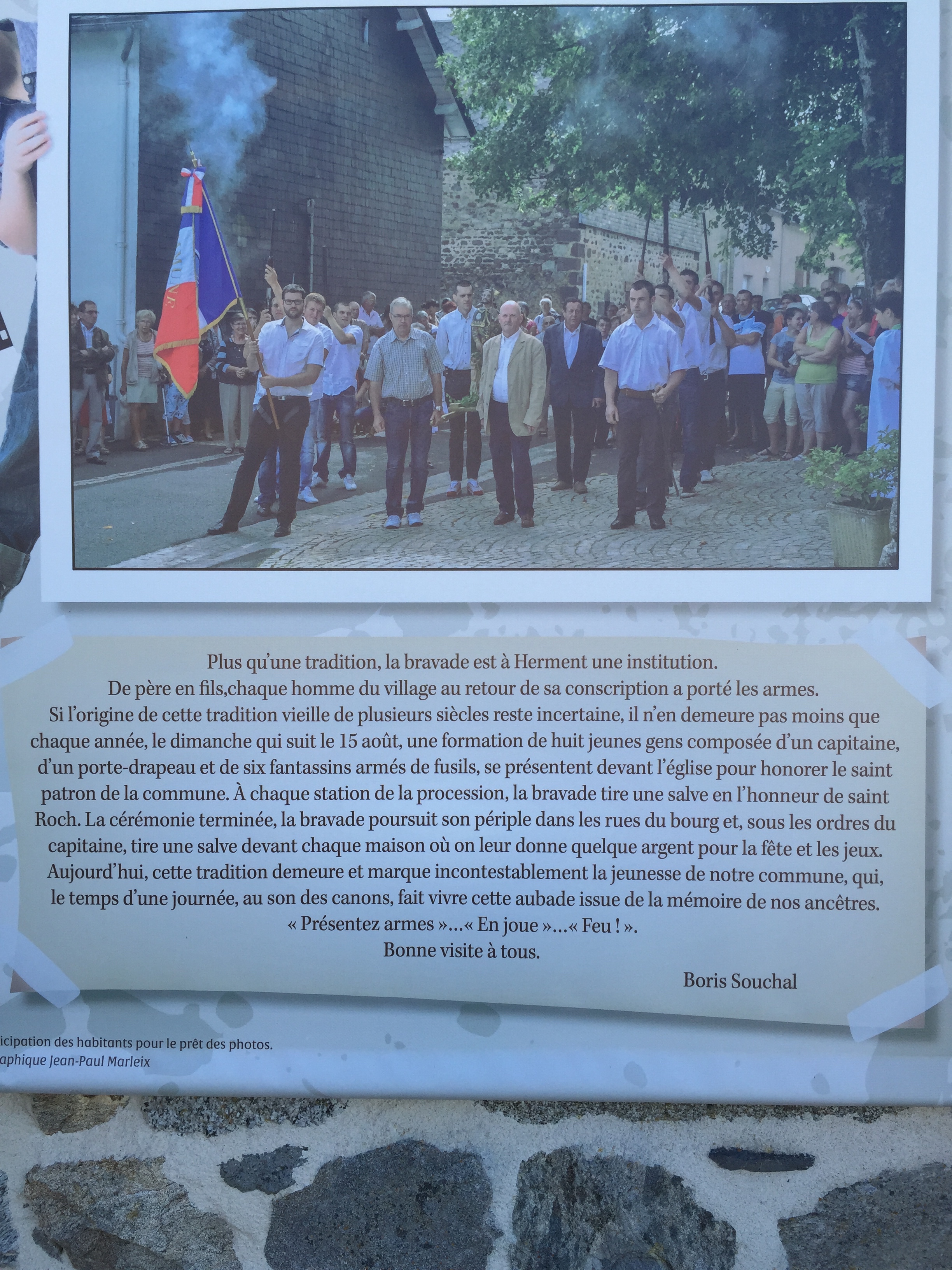 This plaque describes a tradition of the village that Marc did when he was 18. Every year, eight 18 year olds proceed in a procession carrying rifles and shoot at several locations and people are supposed to give them money. They do it to honor the patron saint of the village, St. Roch. He knew several of people in this plaque.