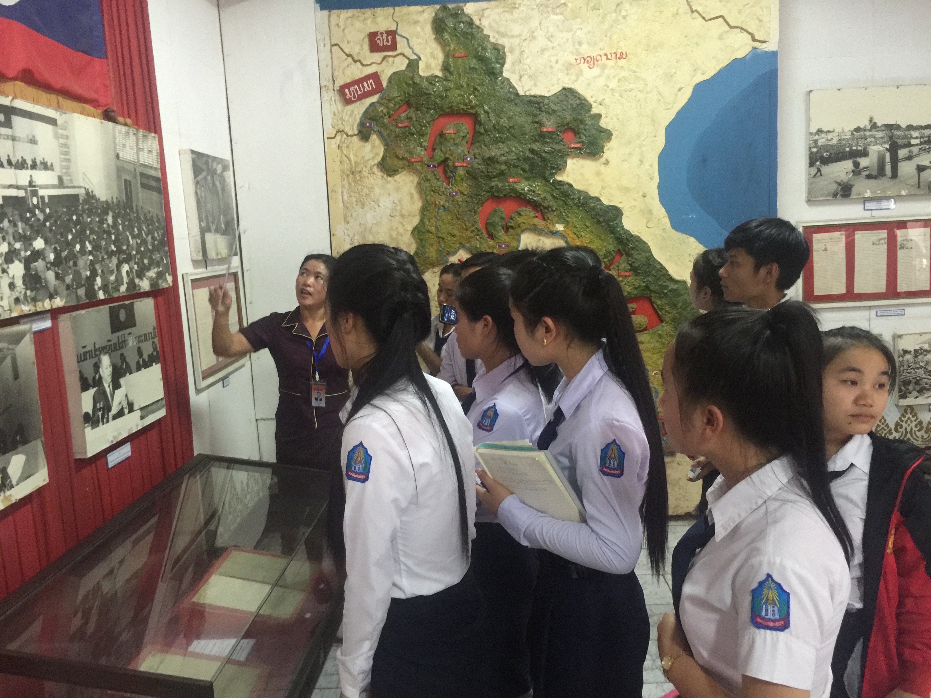 Laos had in common with Vietnam that there were the revolutionary forces on the one side and a pro-American government on the other side. The peasants and most of the people in Laos were on the side of the Pathet Lao, the revolutionary forces, but the pro-American side controlled the larger towns and highways, especially during the day. The museum was clearly on the side of the revolutionary forces since they form the government today. This picture is captioned “Mass rally to greet the victorious outcome of the Geneva Conference in 1954.”